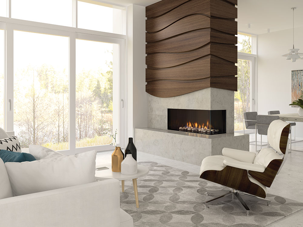Le foyer au gaz ouvert sur 2 côtés Chicago Corner de la gamme City Series de Regency vous donne la flexibilité de créer un foyer aux multiples vues depuis tous les angles de la pièce.